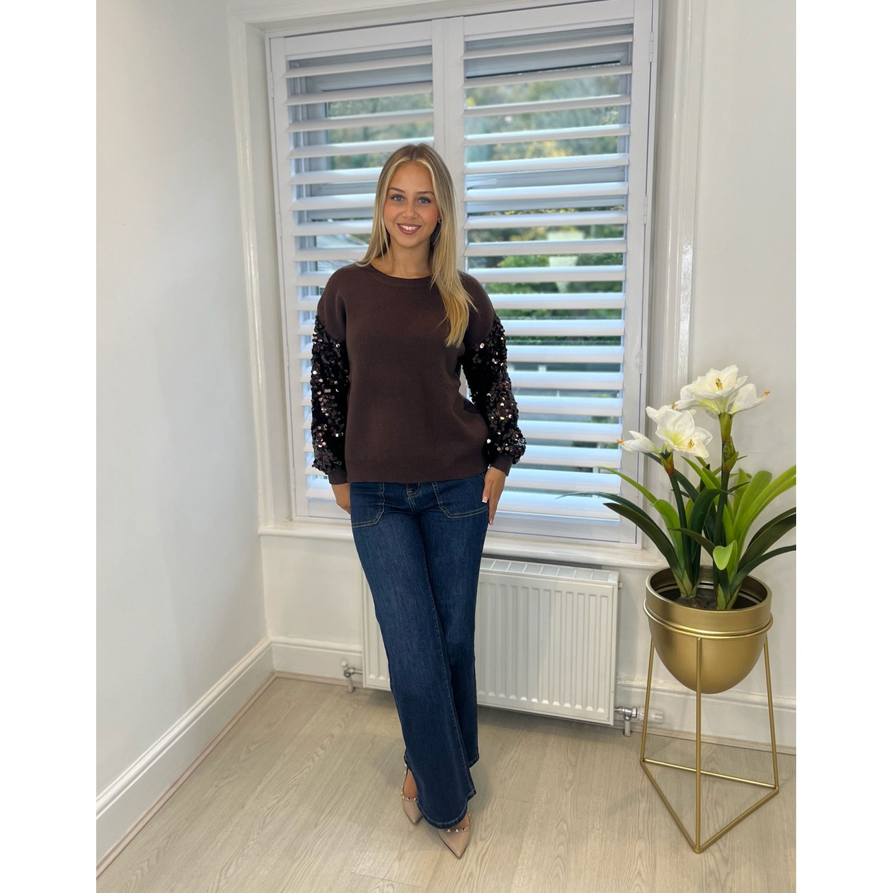 Lucy Cobb Sequin Sleeve Jumper Chocolate
