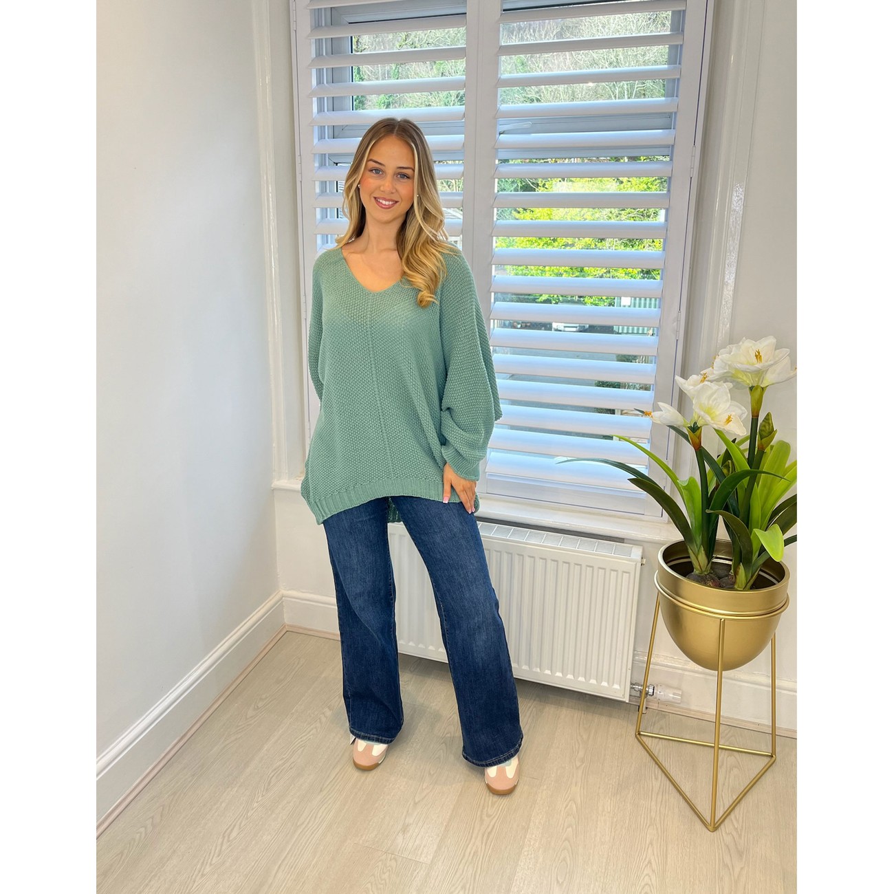 Lucy Cobb V Neck Waffle Knit Jumper Sage